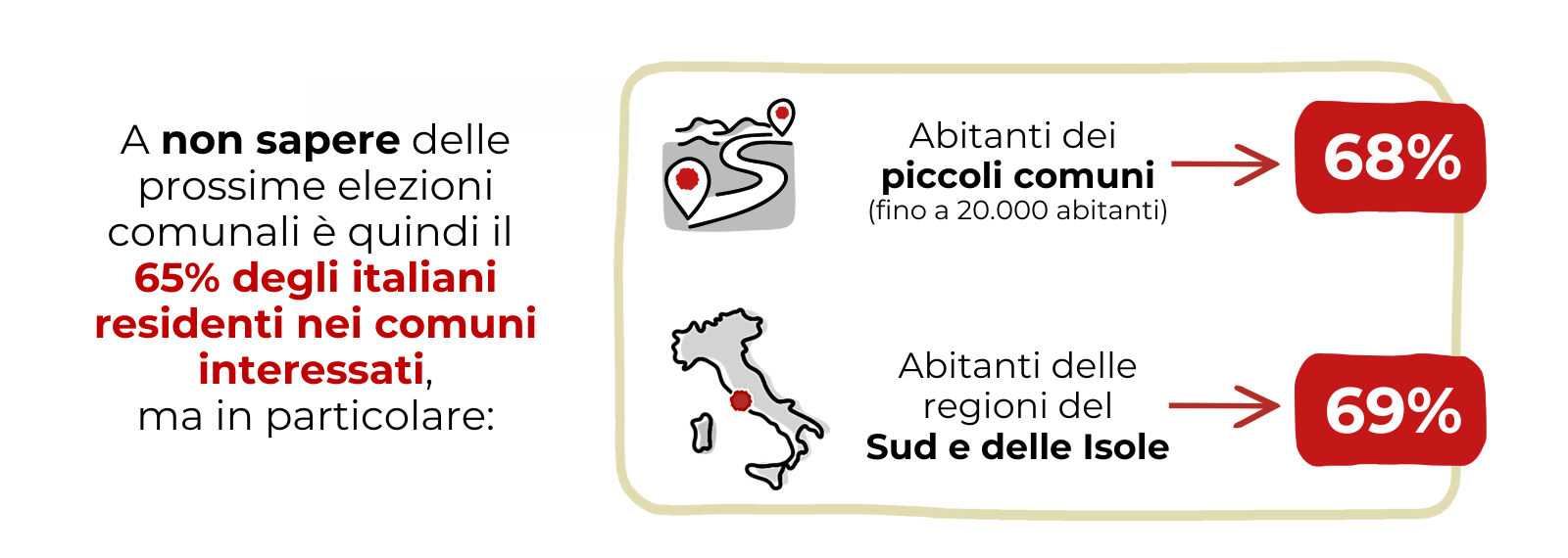 Ma non è la situazione peggiore. Quando guardiamo alle elezioni amministrative (che ricordiamo interesseranno oltre 3.700 comuni italiani) e ai residenti di queste zone, ben il 65% degli intervistati non sa che dovrebbe recarsi alle urne. Anche in questo caso le elezioni si terranno tra meno di due mesi, in concomitanza con le Elezioni Europee. Eppure, sembra che la campagna elettorale non sia ancora iniziata, o per lo meno non si sia ancora entrati nel vivo del dibattito.